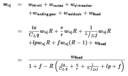 If the oxidizer weight is constrained by KC-135 tanker capacity (150,000 lbs) and offload rate (1500 gal/min -- KC-10 spec), then the total propellant available for consumption at an oxidizer:fuel mixture ratio of 7.25 is 145,070 lb (assuming the aircraft retains at disconnect 85% of the offloaded propellant). This implies a gross weight after disconnect of 158,050 lbs and an injected weight of 12,981 lbs. From equation 10, the maximum fixed weight is 3,447 lbs. Taking an avionics and subsystems weight of 1,200 lbs and a crew and crew systems weight of 1,000 lbs, the net payload is about 1,247 lbs.