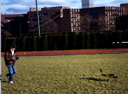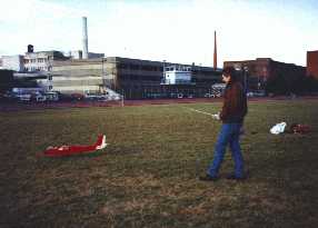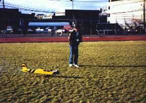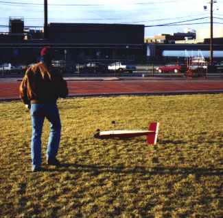 Jay Moore and I get our planes ready for taxi tests without the wings attached. Both planes are Goldberg Eagle II's. Mine, on the left, has a OS 40 FP engine. Jay's has a Super Tigre .45.