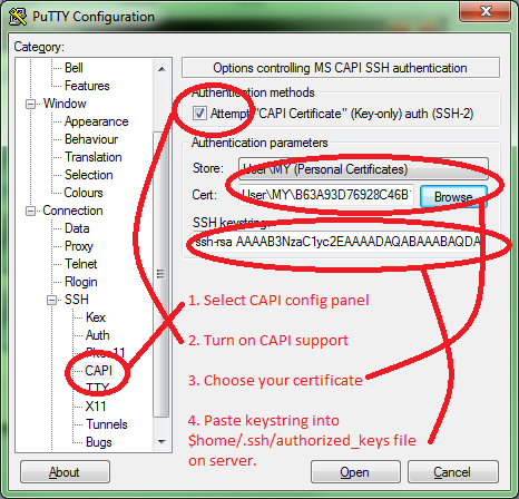 PuTTY-CAC is based on PuTTY SC, but adds the capability to extract public keys from certificates on the card if the public key is not available as a distinct object.